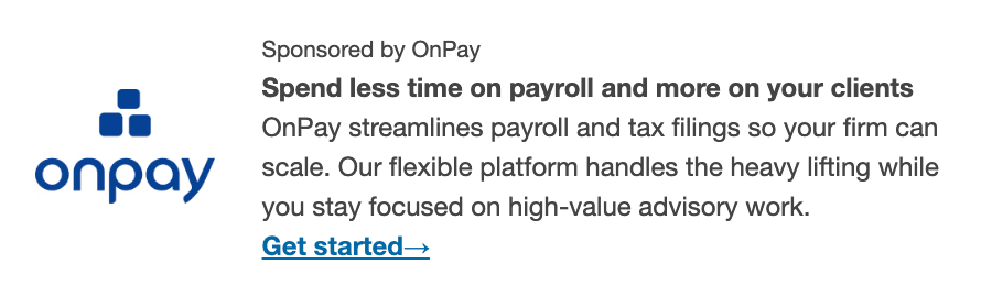 Simplify payroll. OnPay helps accounting firms streamline payroll and tax filings, freeing up time to focus on client work and higher-value advisory services. (Ad)